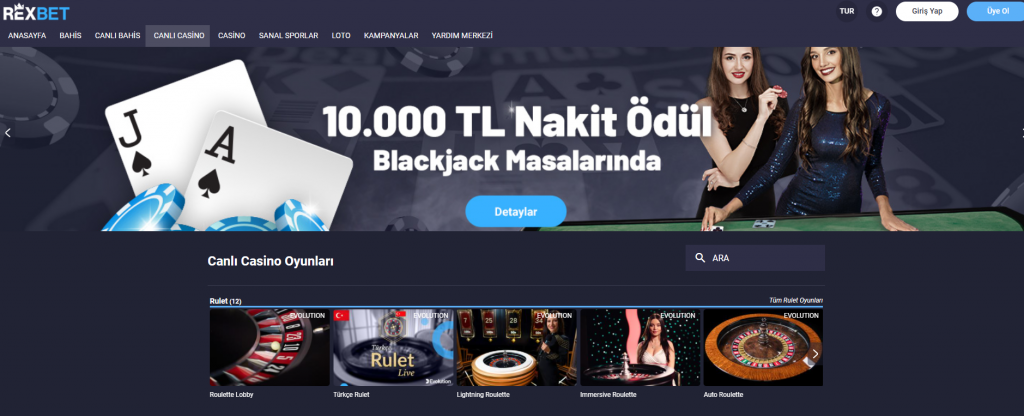 Kazançlı ve keyifli Canlı Casino dünyasına, Rexbet canlı casino lobisine giriş yapmaya hazırlan. Sevilen, güvenilir, heyecan verici canlı casino sitesi Rexbet, en sevdiğiniz Rulet, Blackjack, Barbut, Bakara ve daha bir çok canlı oyun masasını, profesyonel, birbirinden alımlı, güzel türkçe konuşan krupiyerlerle Casino lobisinde sunuyor. Bu heyecana ortak olmak için hemen Rexbet Casino lobisine giriş yap.
